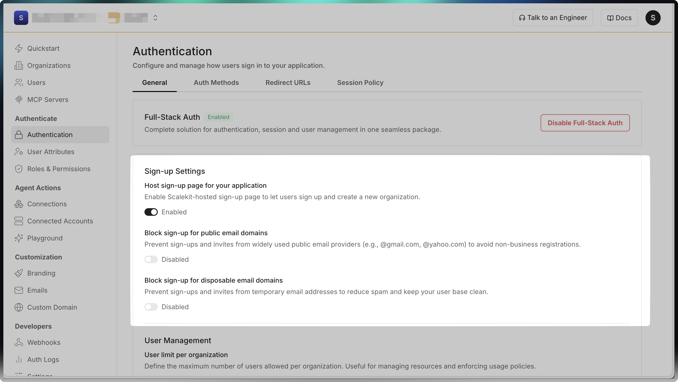Section titled “Set up sign-up restrictions”Sign-up restrictions help you maintain data quality and prevent abuse by controlling who can create accounts in your application. This is particularly important for B2B applications where you need to ensure users have legitimate business email addresses rather than personal or temporary accounts.